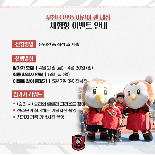 프로축구 구단 부천FC 에서 홈경기를 맞이해 어린이날 이벤트로 체험형 이벤트 참가자를 모집 중입니다. 부천 FC 팬이라면 가족끼리 경기도 관람할 수도 있고 특별한 경험도 선물할 수 있을 것으로 기대됩니다.