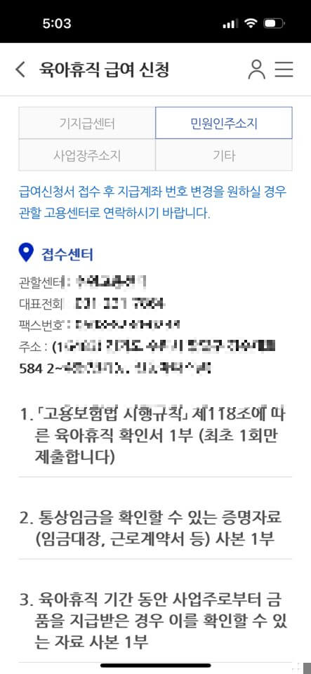 ▶ 저는 회사에서 필요한 서류를 미리 다 제출한 상태라 고용보험 앱으로 육아휴직 급여 신청서만 작성해서 제출했습니다.