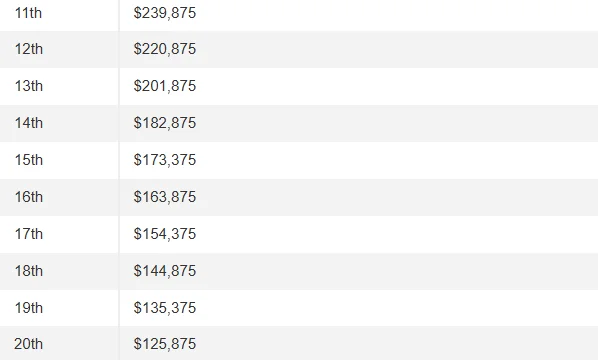 위에 나왔듯 2025 발레로 텍사스 우승상금은 171만달러로 한화로 약 25억원이 넘는 규모입니다. 우승자 외 1위부터 65위까지 상금 분배표 안내드립니다. 순위별 상금을 바로 보고 싶으시다면 아래 사이트에서 바로 확인하실 수 있습니다.