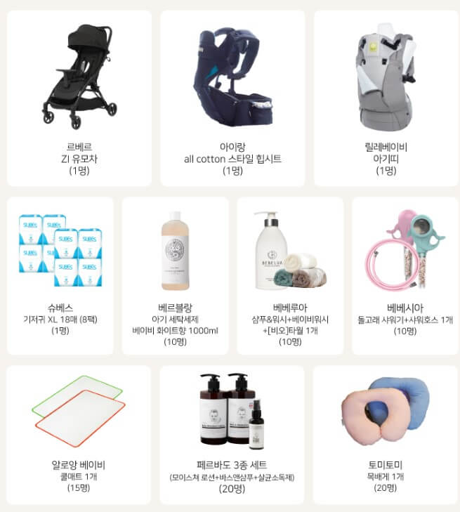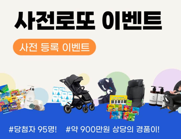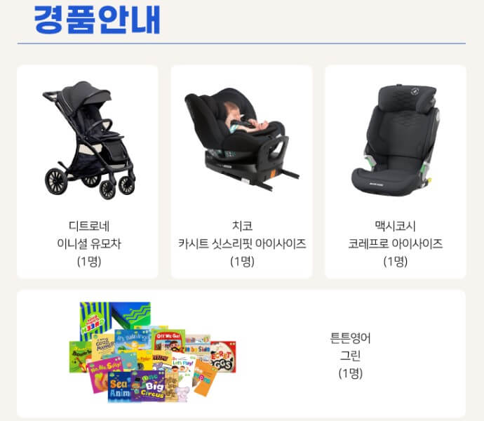 - 경품 : 디트로네 유모차 (1명) , 치코 카시트 (1명), 맥시코시 아이사이즈 (1명), 튼튼영어 그린 (1명) 등 총 95개