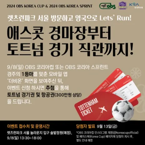 특히 9/8에 진행되는 국제경주 코리아컵에서는 약 300만원 상당의 경품! 토트넘 경기권과 항공권을 받을 수 있는 이벤트가 진행 중입니다. 흔치 않은 기회인만큼 렛츠런파크 서울 밤마실 축제에 참여하신다면 아래 이벤트도 참여해 보시길 바라요!