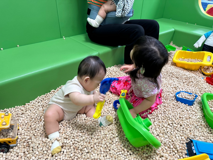 장난감은 많은데 시설이 생긴지 좀 되어서 그런지 작동이 안 되는 장난감들도 꽤 있어서 이 부분은 아쉬웠네요. 그래도 아기가 제일 좋아했던 건 모래장처럼 놀 수 있는 공간이었어요. 만져보고 도구도 들고 파묻혀 보기도 하고 여기서 제일 재밌게 놀다가 왔어요.