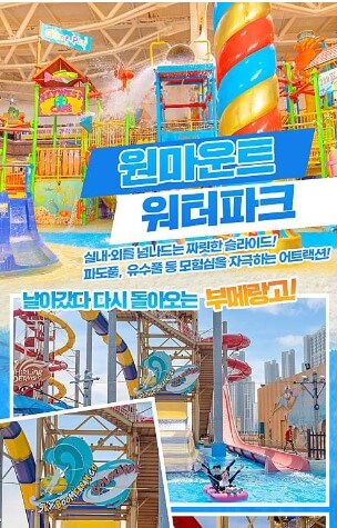 - 특징: 실내와 실외 모두 이용할 수 있어요. 다양한 슬라이드부터 파도풀, 유수풀이 있어서 가족단위로 놀기 좋습니다.