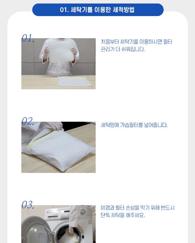 저는 손세탁보다는 세탁기가 편해서 세탁기를 이용해요 :) 세탁 후 건조하지 않고 바로 사용가능한 점도 매력적이에요!