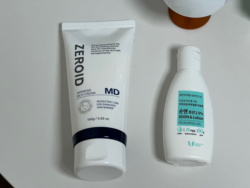 3. 중간에 다시 악화됐을 때 소아과 가서 제로이드와 스테로이드 성분 첨가된 로션을 처방 받아왔습니다. 아래 사진처럼 두피염이 악화된 날은 스테로이드 들어간 로션 조금 짜서 발라주고 머리/ 샤워 시키는 횟수를 줄였습니다. 과거에 매일 목욕과 머리 감겼다면 목욕은 2일에 1번으로 줄이고 머리도 땀 많이 흘리지 않으면 선생님이 안 감겨도 된다고 하셔서 아기 컨디션에 따라 조절했어요. 그래도 혹시 몰라서 머리는 매일 감겨주는 편이긴 했습니다.