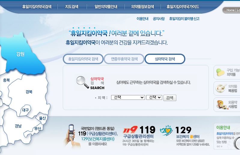 ■ 찾는 방법 : 휴일지킴이 홈페이지 > 심야약국 검색 > 지역 입력