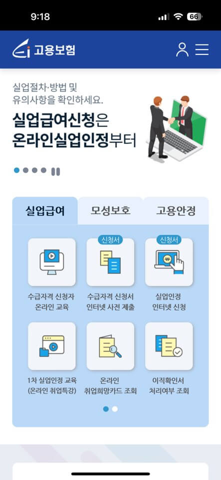 - 고용보험 홈페이지 또는 모바일앱에 접속합니다. (홈페이지로 접속하기)