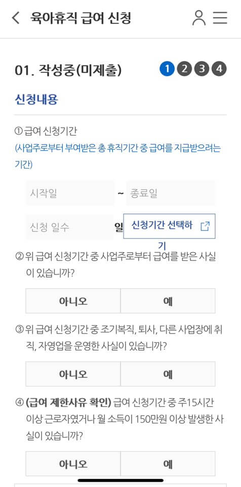 - 육아휴직 급여 신청 페이지가 뜹니다. 특이사항 없는 경우 모두 아니오 누르시면 됩니다. 만약 매월 신청하지 못했다 하더라도 한 번에 일괄 신청할 수 있으니 참고해 주세요!