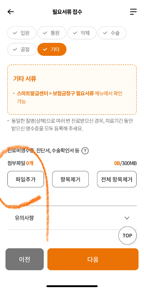 3.증빙서류를 핸드폰으로 미리 찍어서 준비해 주셨다가, 필요서류 접수 선택해서 파일을 업로드합니다. 만약 이전에 동일한 진료 내용으로 다른 건 신청할 경우 이전 내역에서 불러다가 증빙자료만 업로드 해서 신청도 하실 수 있습니다. 그게 아닌 경우에는 새로 신청하기 눌러서 마찬가지로 증빙서류 제출하시면 됩니다.