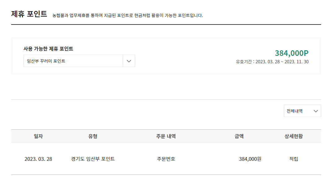임산부 1인당 연 480,000원으로 정부에서 지원되는 총 지원액은 384,000원입니다. 자기 부담금 20%인 96,000원만 내면 월 4회 친환경 농산물과 유기가공식품등을 구매할 수 있습니다. 경기도 내 지역마다 이용할 수 있는 몰이 다른 것 같습니다. 제가 거주하고 있는 수원시의 경우 농협몰로 지정되어 있습니다.