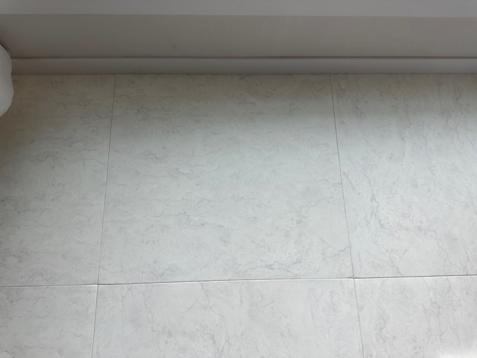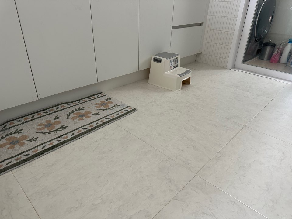 일단 견적서 조사 당시 유일하게 타일 사이즈가 600x600 이 있었던 이유가 가장 컸습니다. 제가 선택한 타일 종류는 스노우마블입니다. 제가 생활하며 찍은 사진보다 실제론 더 밝은 점 참고해 주세요.