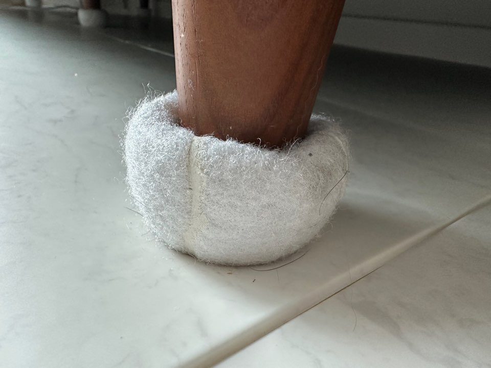 상상매트는 두께가 2cm 정도인데 거실 테이블이랑 tv서랍장은 남은 자투리 매트로 자국이 생기지 않게 후속 조치를 해주셨어요. 소파는 테이블공을 따로 껴주시는데 소파 생활을 많이 하다보니 테이블공 끼워도 자국이 남긴 해요.